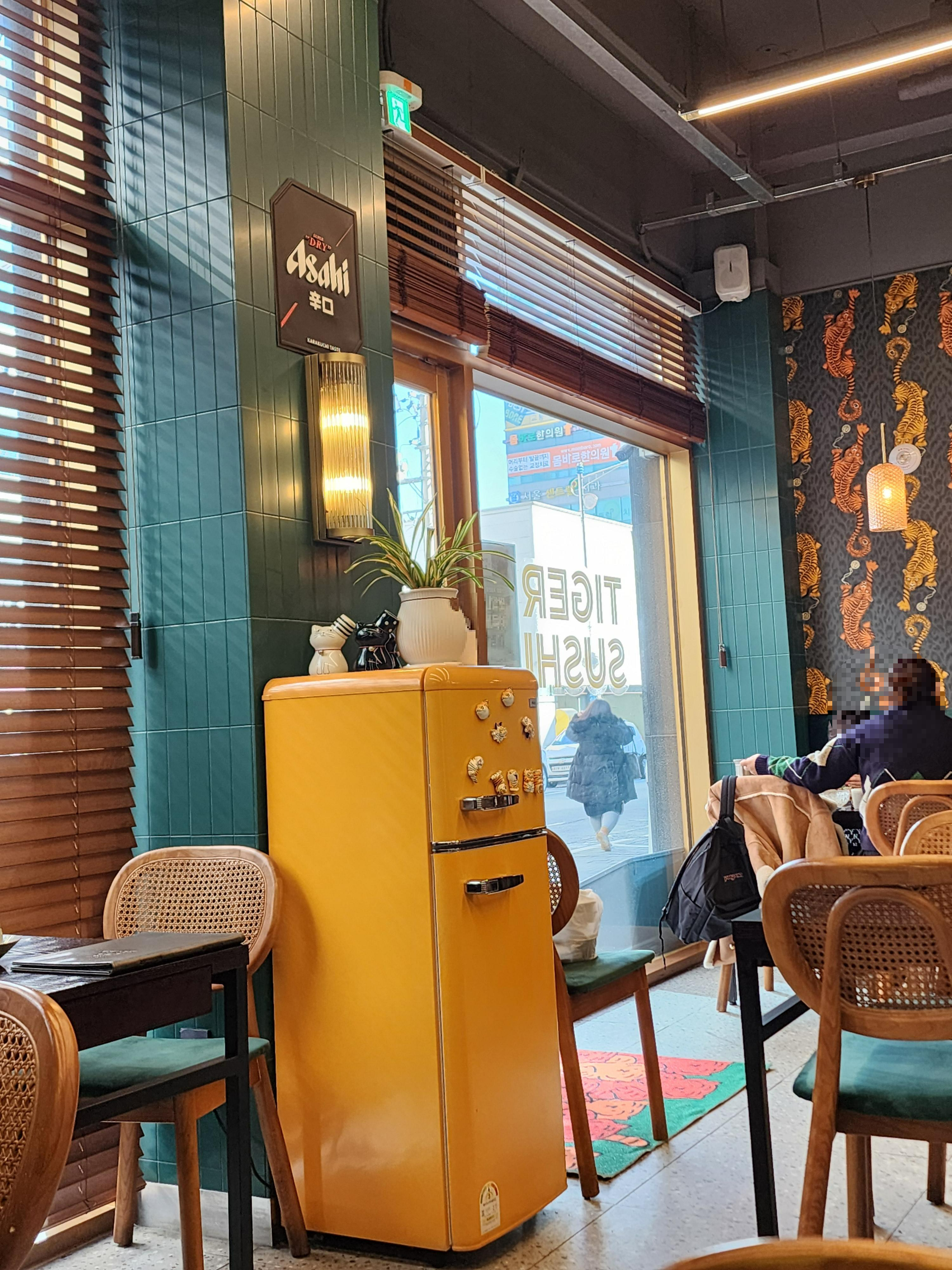 이름에 홀려 들어간 김포 장기동 맛집 [호랑이초밥]은 높은 층고 때문인지 꽤 쾌적하게 느껴졌구요, 호랑이 그림의 벽지에 인테리어 미니 냉장고가 깜찍하더라구요. ㅋ