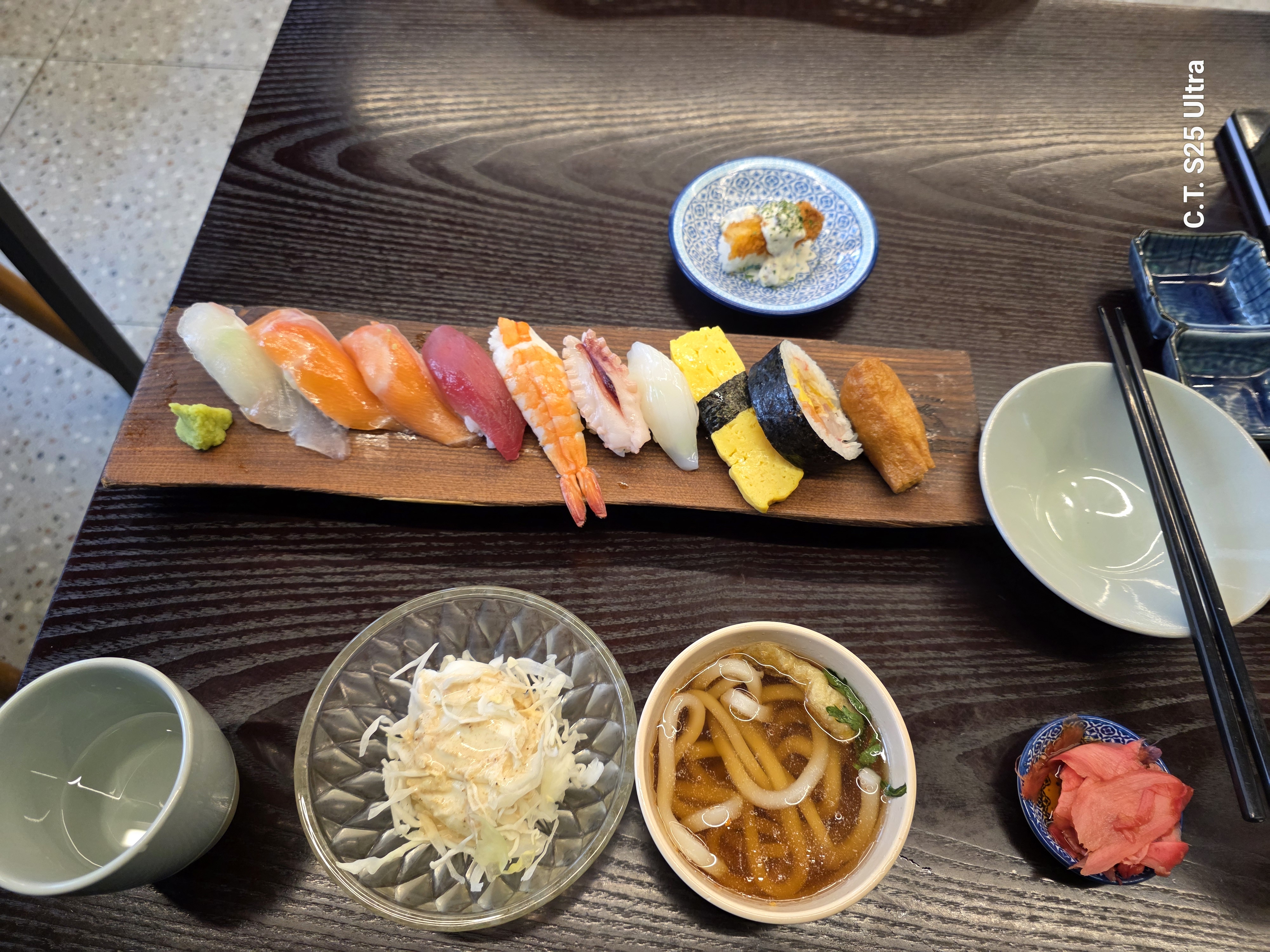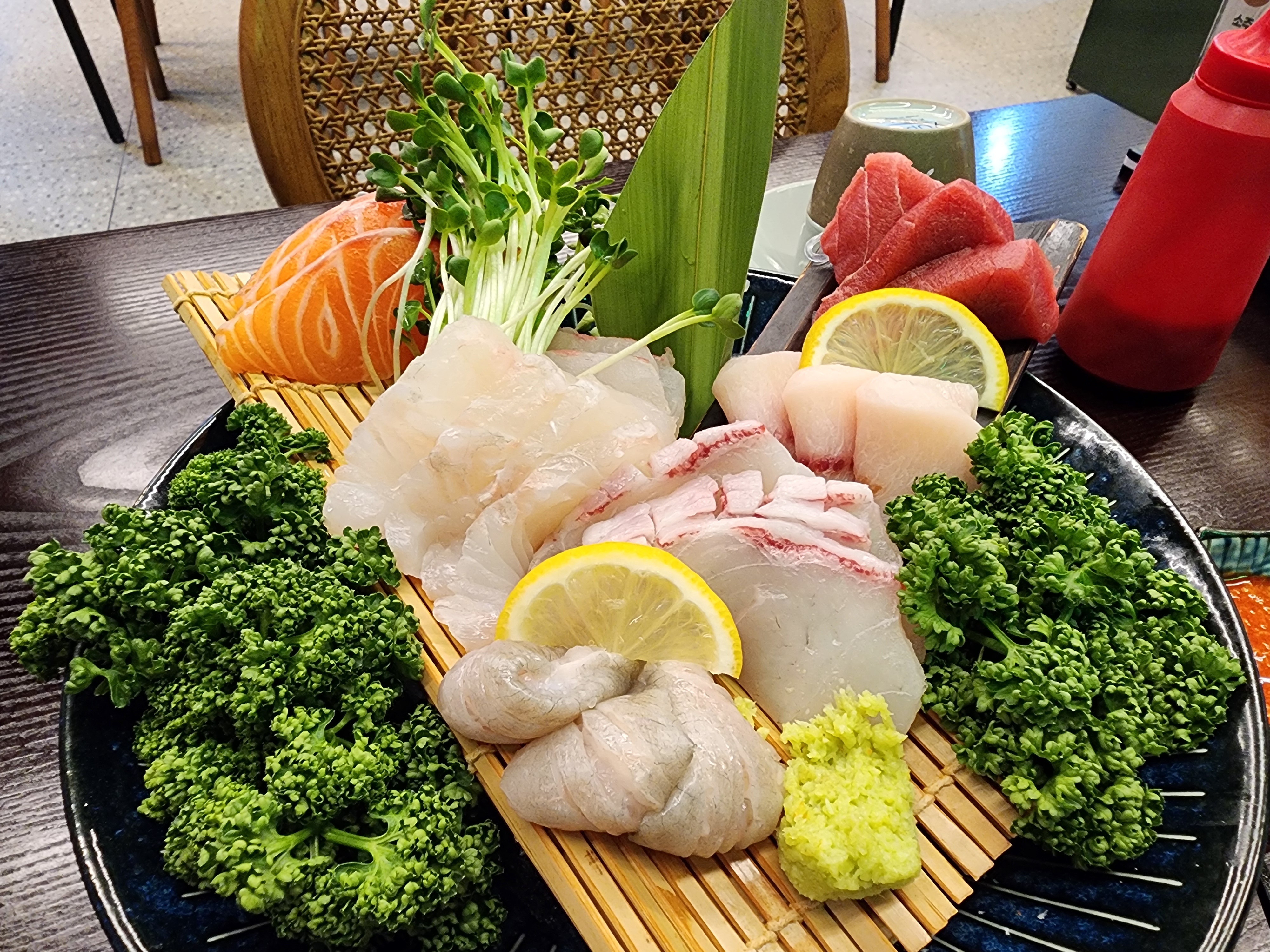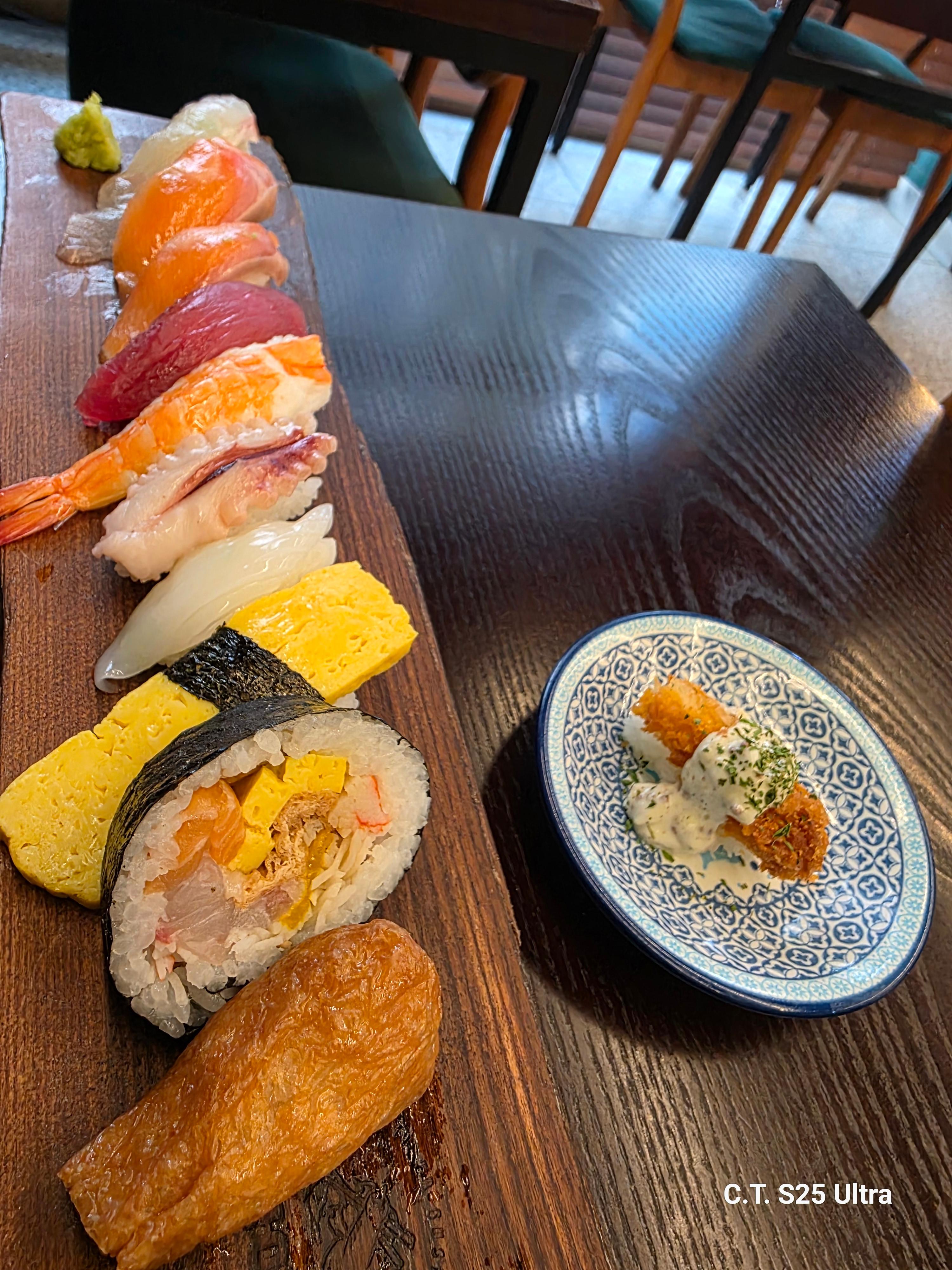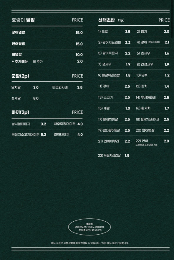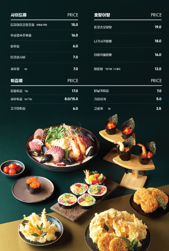 - 주요메뉴 : 각종 초밥(세트, 단품), 사시미, 탕 종류(차돌폭탄짬뽕, 나가사키짬뽕, 매운탕), 덮밥(장어, 연어, 회), 기타(도미머리조림, 새우튀김, 새우장, 고로케, 치킨가라아게)