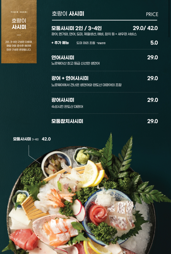 김포 장기동 맛집 [호랑이초밥]에서 혼술을 할 때는 사시미를 주문해서 먹었었는데요, 2인용 사시미는 모둠이던 광어 한종류던 가격이 29,000원이었던 걸로 기억해요.