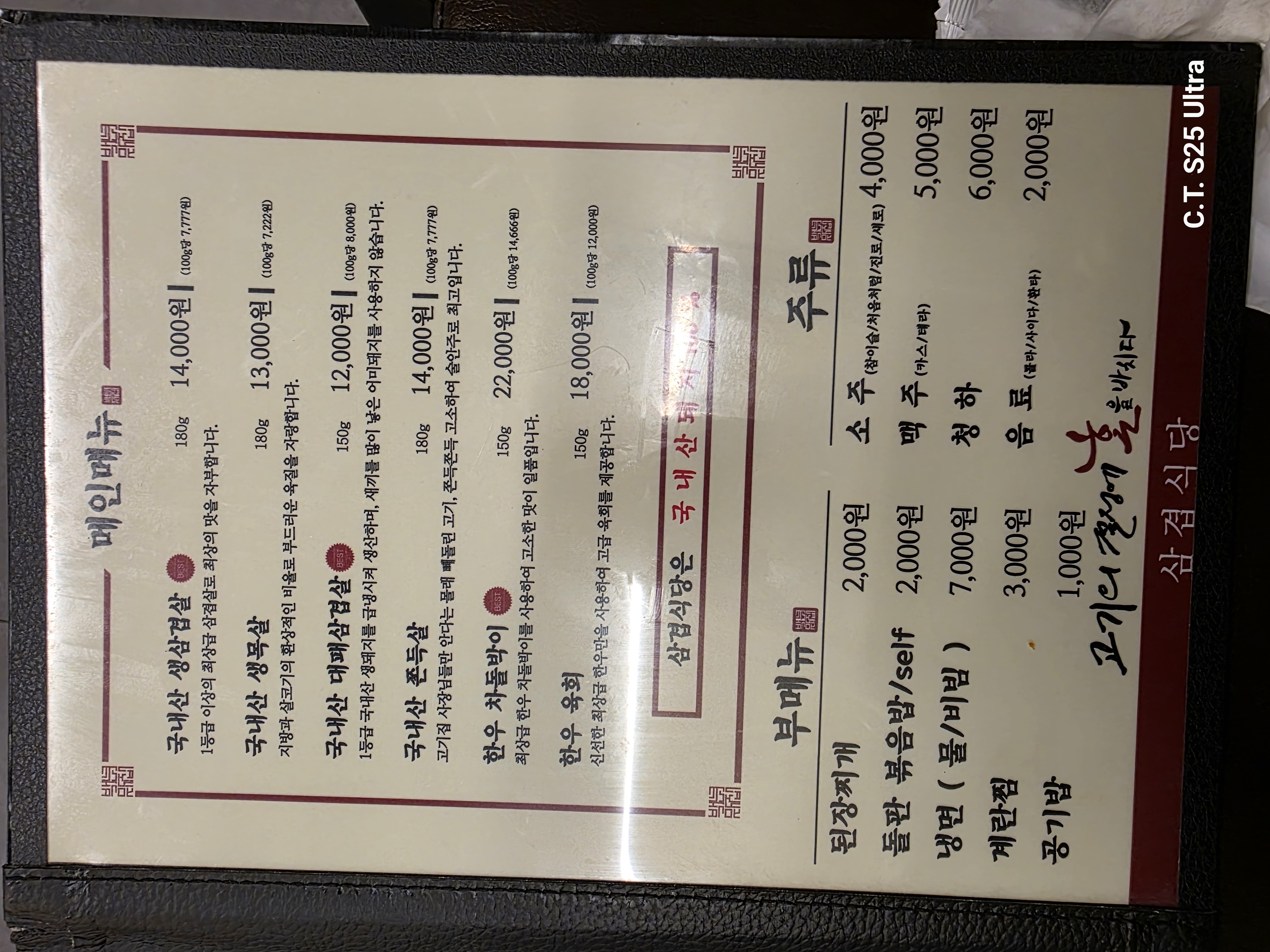 - 주요메뉴 : 생삼겹살, 대패삼겹살, 생목살, 쫀득살, 차돌박이, 육회