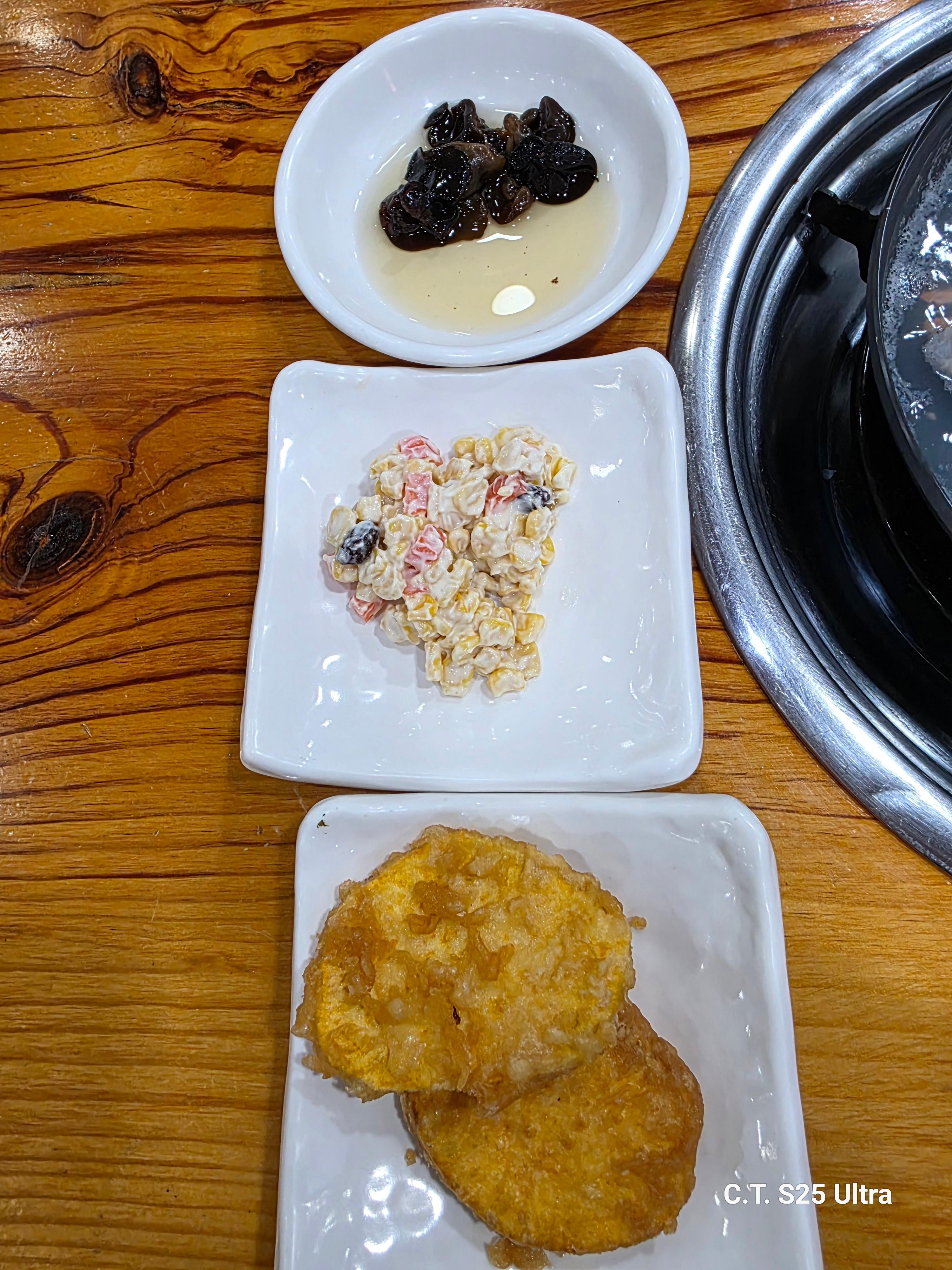 기본찬으로 맛보기 아구지리탕이 나오고, 열무김치, 도토리묵, 콘샐러드, 버섯, 고구마튀김이 나오고, 오늘의 주인공인 '아구찜'이 나왔어요.