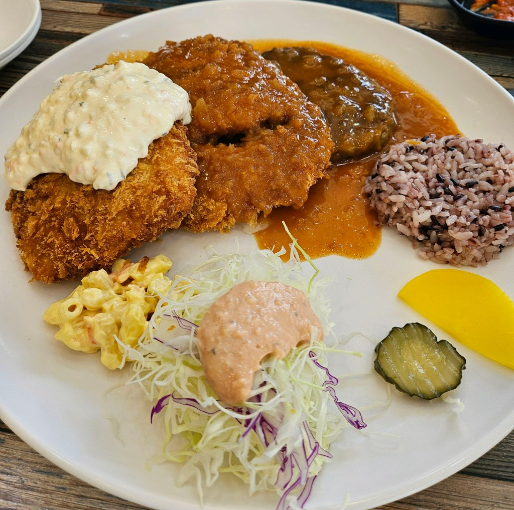 [김희라왕돈까스전문점] 정식은 왕돈가스+생선가스+함박스테이크로 구성되어 있구요, 다양한 메뉴를 골고루 먹어볼 수 있어서 좋았어요.