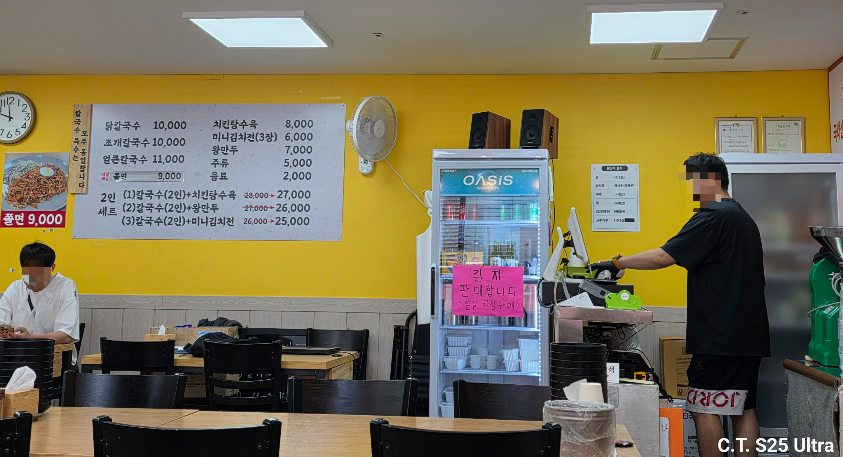 - 주요메뉴 : 닭칼국수(10,000원), 얼큰칼국수(11,000원), 조개칼국수(10,000원), 쫄면(9,000원), 치킨탕수육(8,000원), 만두(7,000원), 미니김치전(6,000원), 2인 세트메뉴