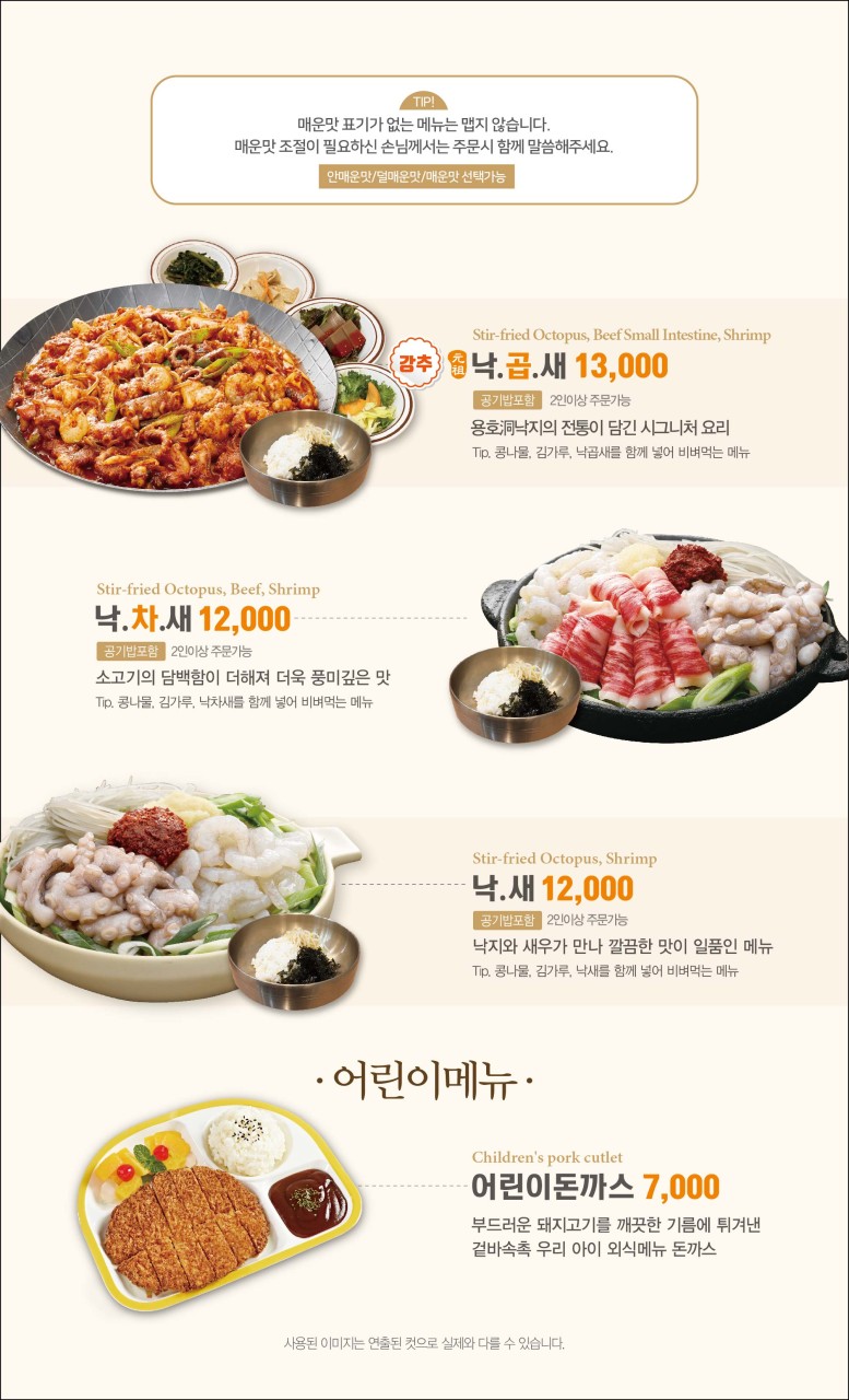 - 낙곱새(13,000원/1인분), 낙차새(12,000원/1인분)
