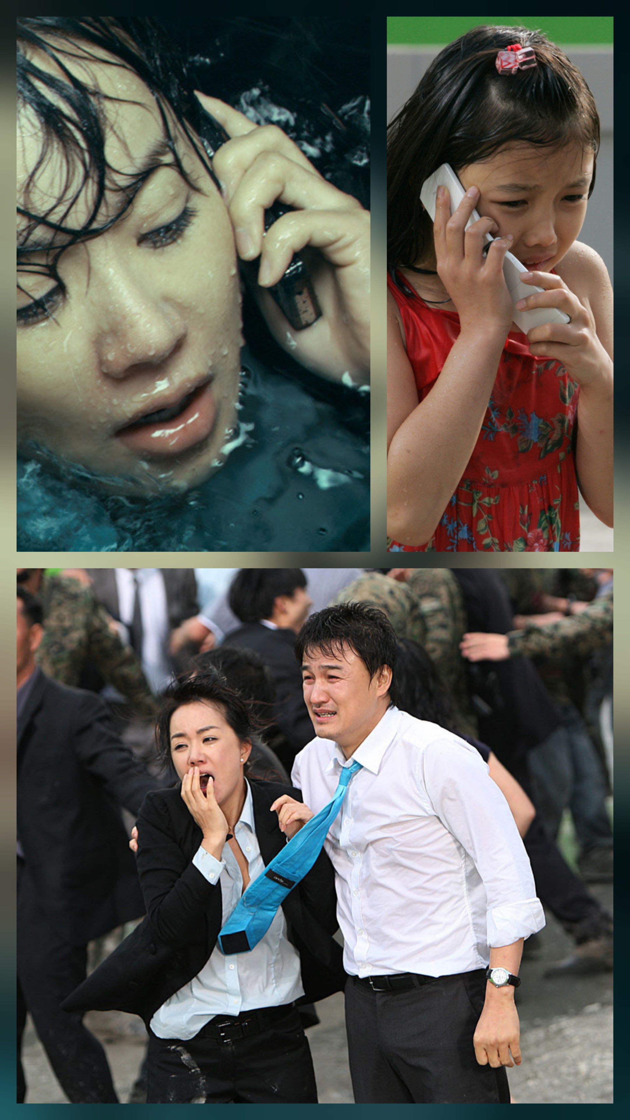 2. 쓰나미가 다가오는 고층건물에 있던 유진, 딸 지민이를 구하기 위해 김휘도 달려오고 지민이를 데리고 옥상으로 대피하지만 유진은 물이 차오르는 엘리베이터에 갇혀서 전화로 딸 지민에게 옆에 있는 아저씨가 니 아빠라며 진실을 얘기해 준다.