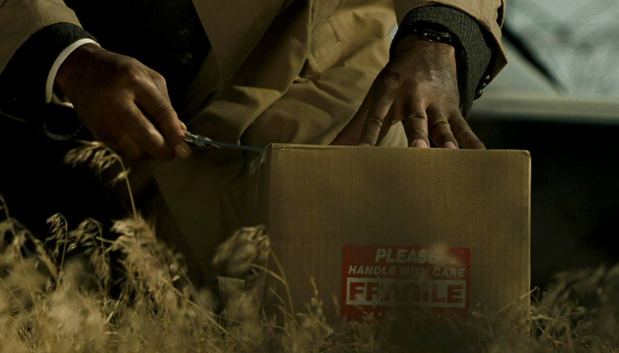 달려오던 차에서 내린 운전자는 택배를 시간 맞춰 전달해 달라는 의뢰를 받아다며 서머셋에게 박스 하나를 전하고 사라지고, 박스를 열어본 서머셋은 깜짝 놀라 뒷걸음질 치며 밀스를 쳐다본다.