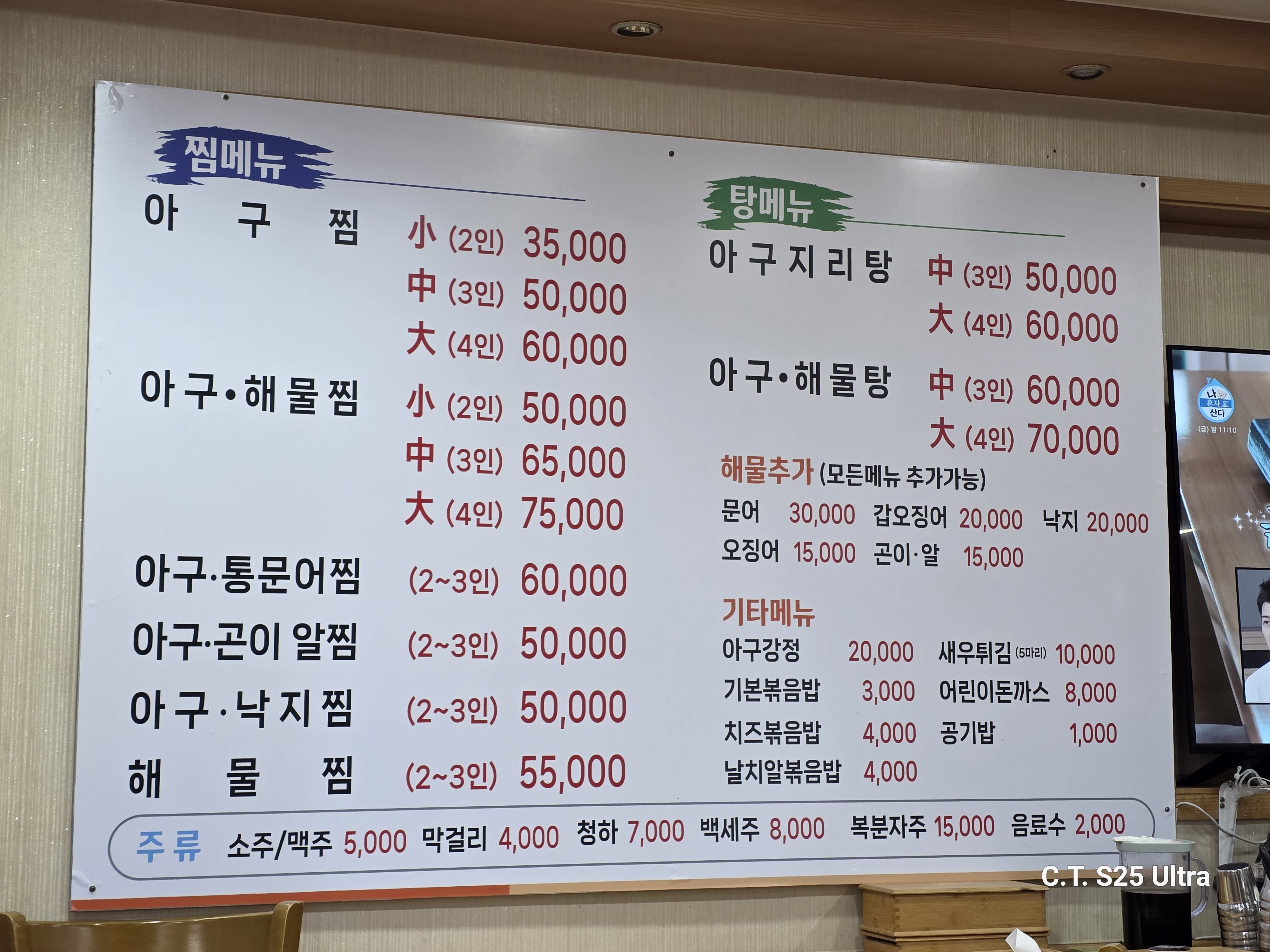 - 대표메뉴 : 아구찜, 아구해물찜, 아구통문어찜, 아구곤이 알찜, 아구낙지찜, 해물찜, 아구지리탕, 아구해물탕