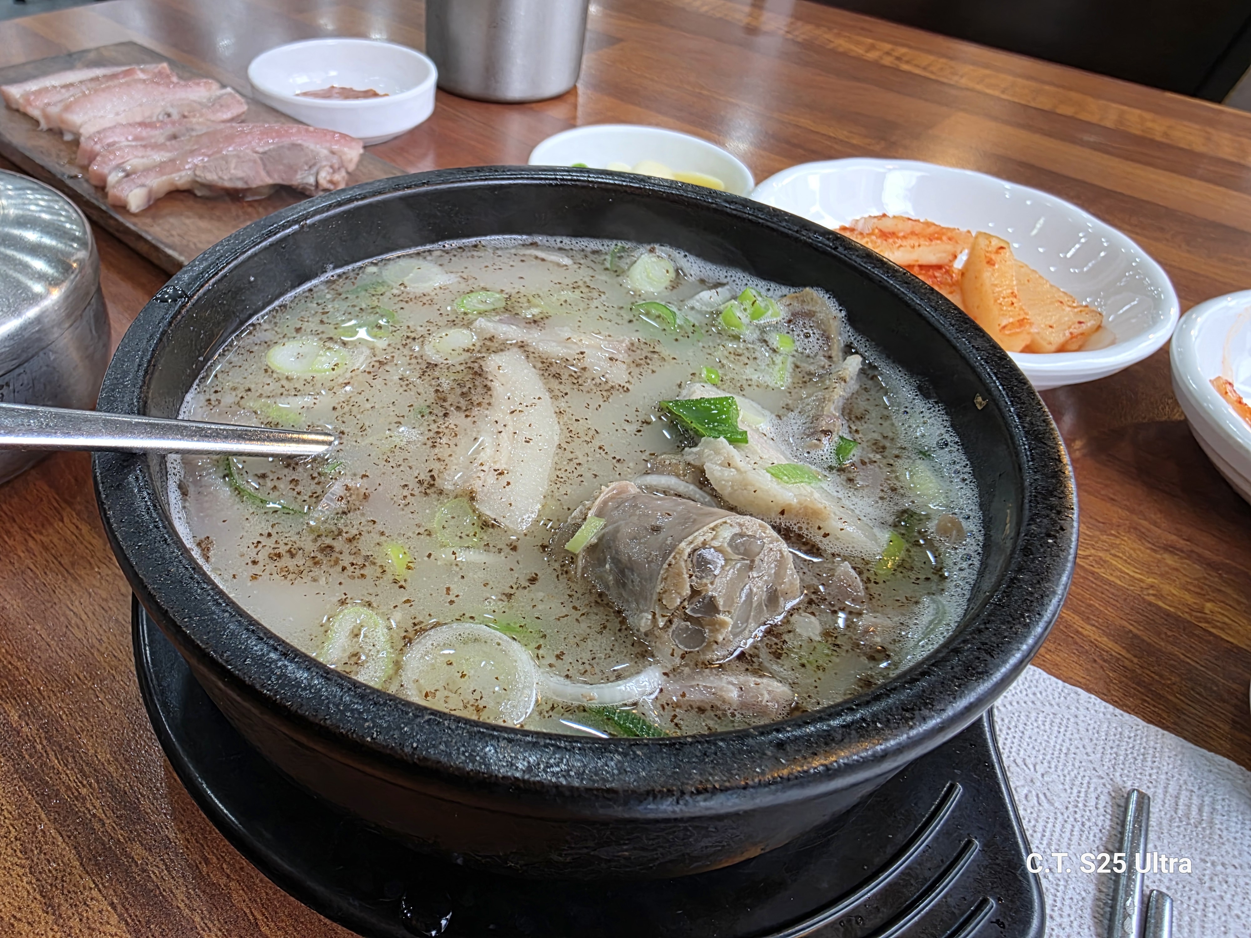 1. 셀프바에서 가져온 마늘편과 고추를 순대국에 넣어두면 먹을수록 국물이 칼칼하고 개운해집니다.